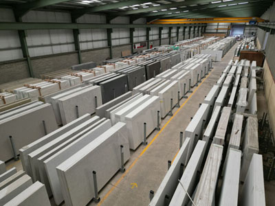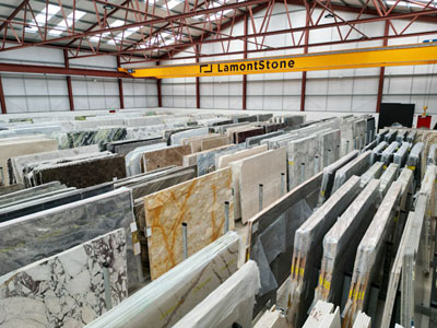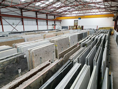 This showroom is located across three large warehouses within our factory complex, where you can view full slabs in person.